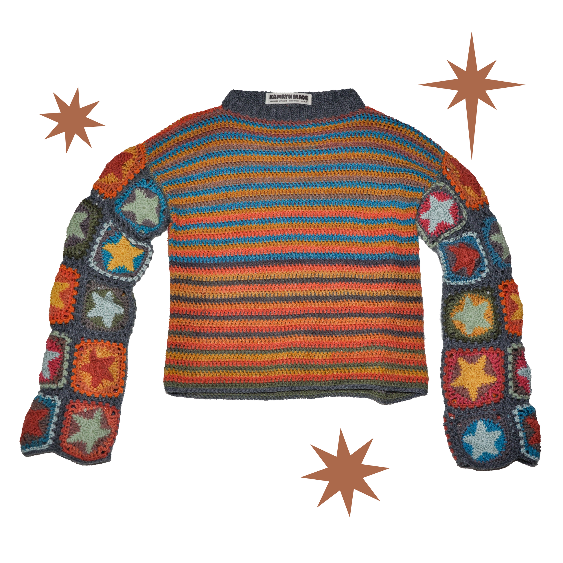 Although I always prefer working with natural fibers, the acrylic/nylon mix used for the body of the sweater is super soft, made even softer with a gentle wash. The neckline is crocheted with a wool blend fiber that is pre-shrunk and as soft as the rest of the sweater.